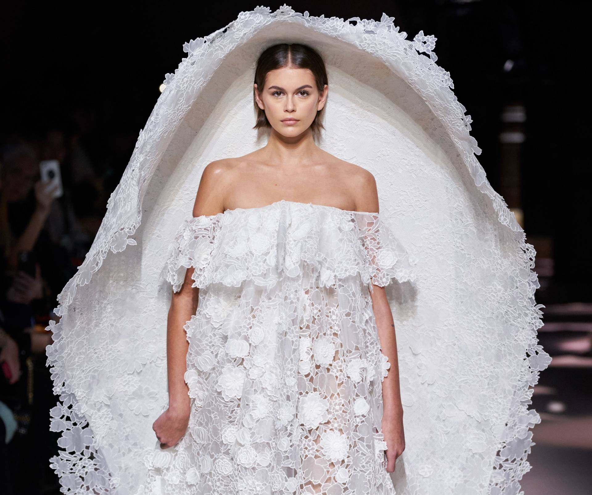 В конце показа подиум превратился в свадебную часовню. Воплотить образ идеальной невесты Клэр Уэйт помогла модель Кайя Гербер, которая закрыла шоу в белом кружевном платье с открытыми плечами и огромной шляпе-фате со шлейфом, украшенным цветочной аппликацией.