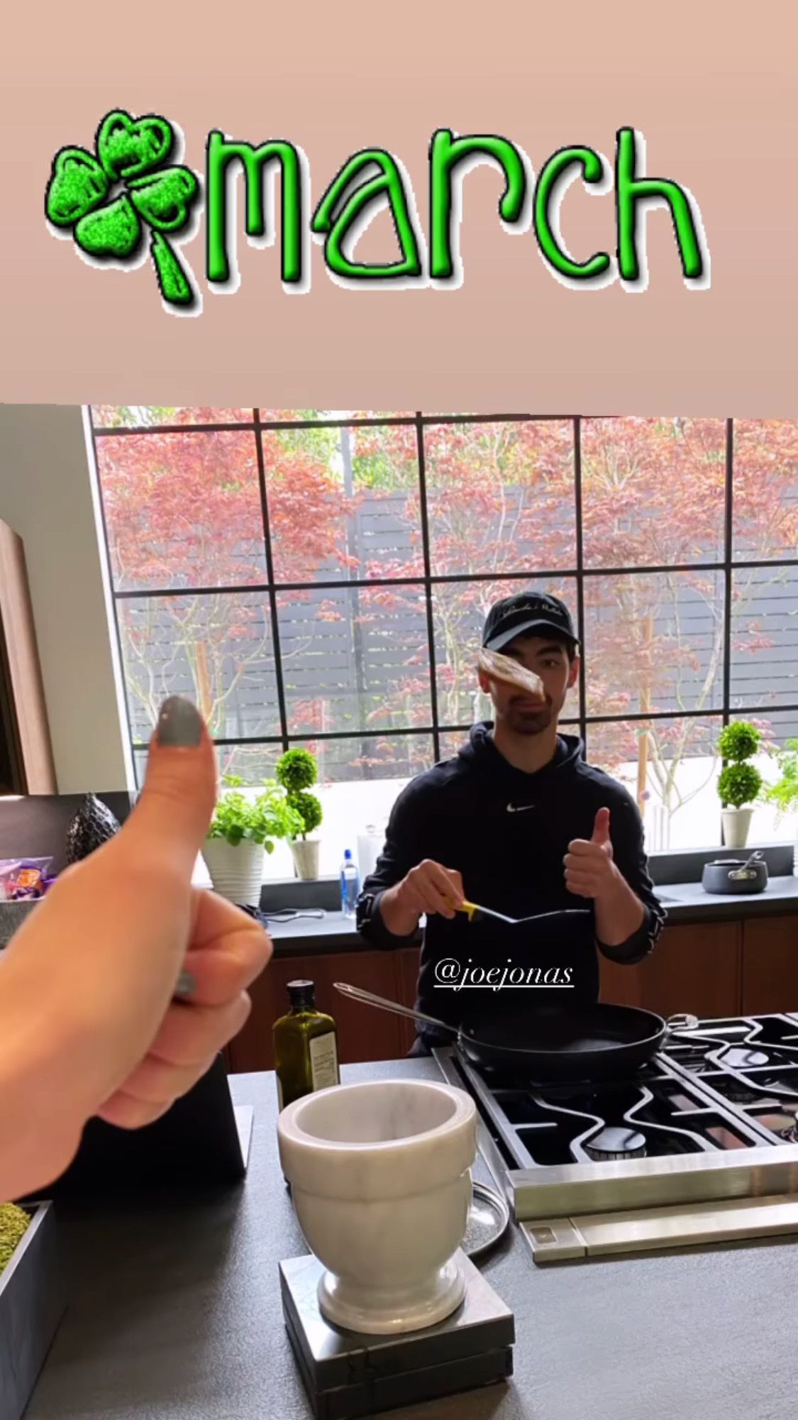 Хотя она не поделилась ни одной фотографией своего ребенка, она показала Джо на фотокарточке, сделанной марте, где он позировал на кухне и, кажется, собирался что-то приготовить.