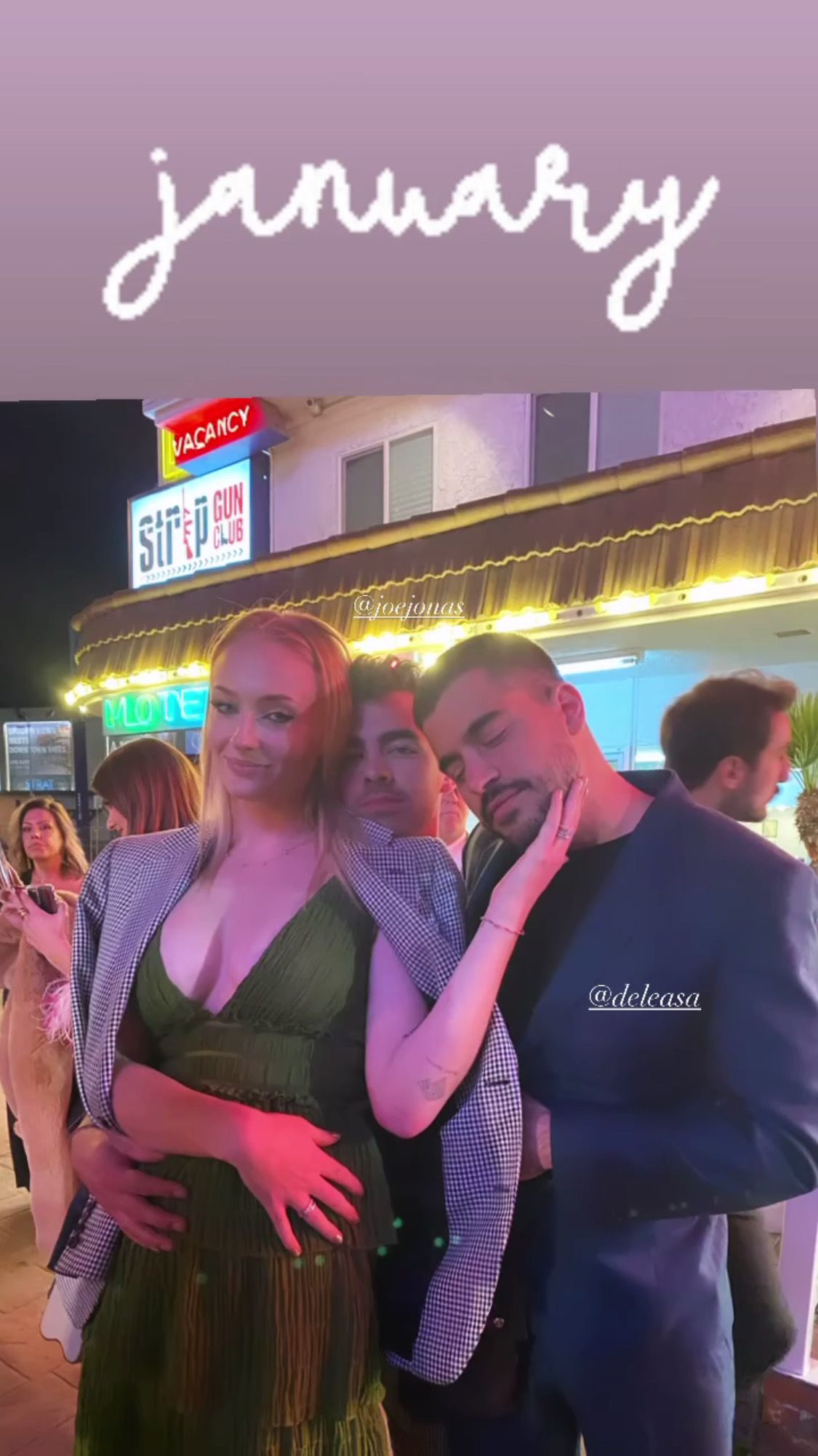 Одной из самых трогательных оказалась фотография, сделанная в январе 2020 года. На снимке беременная актриса позировала с мужем и его братом Кевином Джонасом перед стрип-клубом в Лас-Вегасе. Софи была в роскошном зелёном платье с глубоким вырезом, подчёркивающим ее декольте. На снимке она нежно обняла свой живот и радостно смотрела в камеру. Фотография, конечно, была сделана в самом начале ее беременности, когда об этом не было известно широкой публике.
